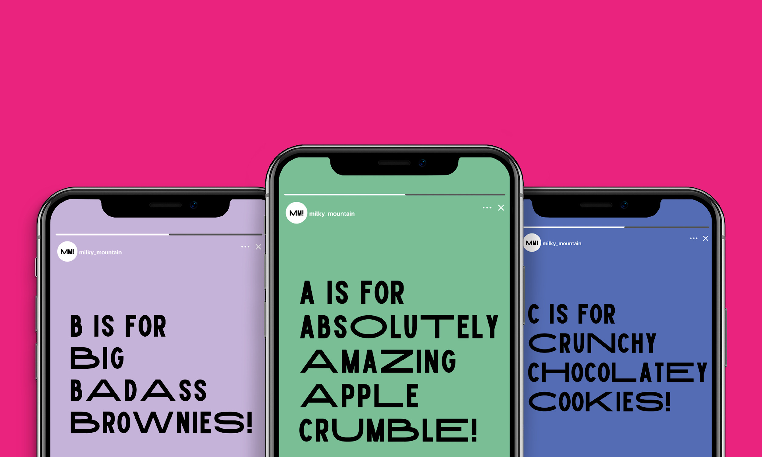 在這個新的設計系統中,語言構成了標志。代表 Milky Mountain 的首字母縮寫,同時作為表達純粹愉悅和享受的聲音加倍,新標志表達了該品牌甜食的全部內容,并在千篇一律的海洋中實現了真正的突出和相關性。該標志還巧妙地融入了表達味道和甜味的文字中。
