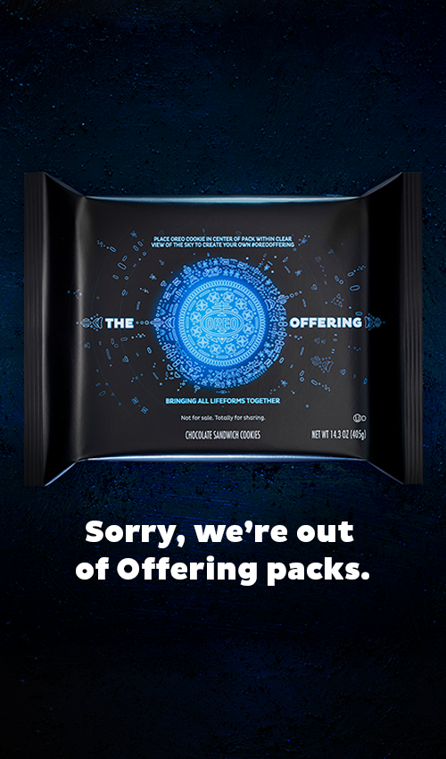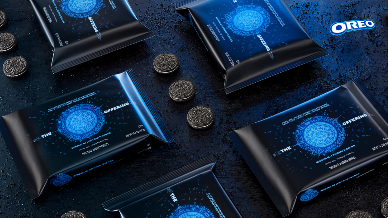 包裝設(shè)計采用黑色背景和由藍(lán)色閃亮字形組成的奧利奧餅干,發(fā)光和圖形元素集中在中心。袋子上的副本指示消費者將奧利奧放在黑暗的天空下,這是一種星際和平的禮物。深色背景和藍(lán)色字形讓人想起媒體中經(jīng)常描繪的虛構(gòu)外星技術(shù)。