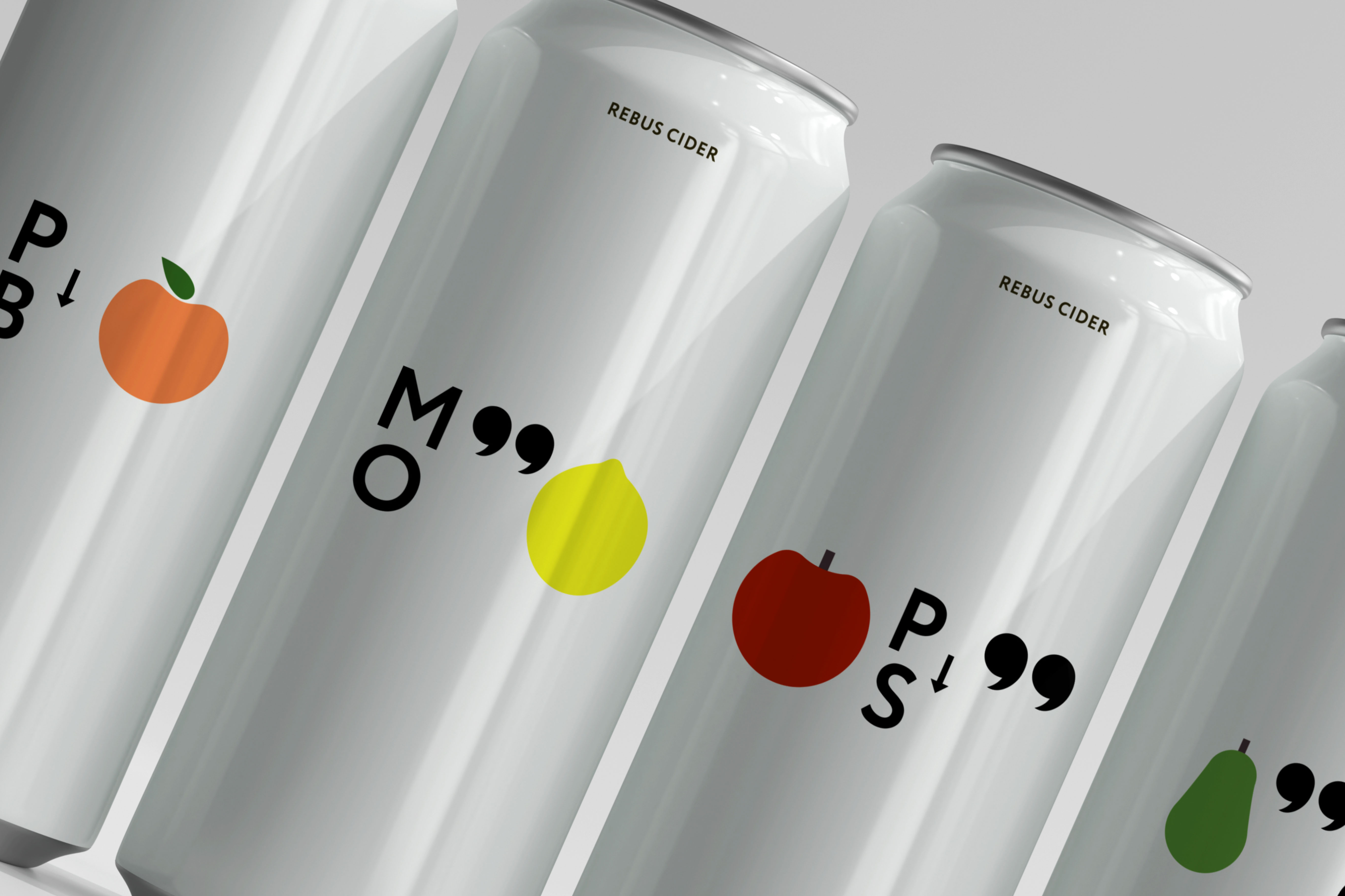 酒包裝設計——Rebus Cider 的設計靈感來自平面設計師 Paul Rand 和他基于 rebus – Think 的 IBM。拼圖,謎語,英語文化中常用的一種技巧,其中字母由于發音的特性而獲得新的含義。蘋果酒的 rebus 線也是由 rebuses 創造的。水果的圖標是蘋果酒口味的指標:蘋果、桃子、梨和檸檬。